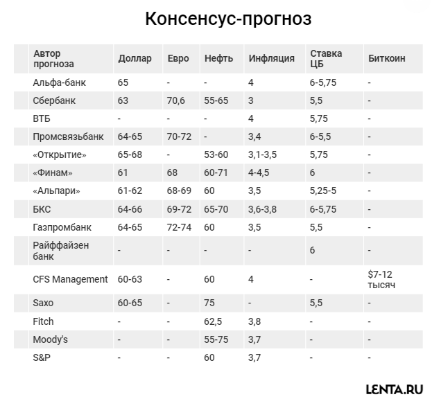 lenta.ru Среди опрошенных «Лентой.ру» экспертов главным пессимистом стал Максим Петроневич из «Открытия». Аналитик прогнозирует, что к концу 2020 года нефть может упасть до 53 долларов за баррель. Примечательно, что прошлогодний консенсус-прогноз, составленный «Лентой.ру» оказался недалек от истины. Так, аналитики в среднем ожидали, что стоимость барреля Brent составит 65,27 доллара. По состоянию на 30 декабря 2019 года цена была зафиксирована на уровне 66,63 доллара. Дальше всего от реальности оказался прогноз Сергея Дроздова из «Финама» — он предполагал, что нефтяные котировки могут упасть ниже 50 долларов в 2019 году. Предельная мягкость Консенсус-прогноз по нефти на конец 2020 года: стоимость барреля марки Brent — 63 доллара. Ключевая ставка Центрального банка определяет, по какой цене коммерческие банки могут получить кредит у регулятора — чем ставка выше, тем деньги «дороже» — их сложнее получить. От ставки зависит весь финансовый рынок и доступность денег в экономике. Значение ключевой ставки для простых россиян заключается в том, что она напрямую влияет на ставки по депозитам и кредитам в коммерческих банках. В прошлом году подавляющее большинство экспертов ожидало повышения ставки. Однако прогнозы не оправдались, и к концу 2019 года ставка составила 6,25 процента годовых. Наиболее консервативный прогноз тогда дала заместитель директора аналитического департамента «Альпари» Наталья Мильчакова — 8,5 процента по итогам 2019 года. Теперь настроения экспертов изменились, и все без исключения ожидают, что Банк России продолжит снижать ставку в 2020 году. Однако в отношении того, насколько далеко пойдет глава регулятора Эльвира Набиуллина, прогнозы разнятся. Например, главный аналитик Промсвязьбанка Денис Попов считает, что в конце года ставка зафиксируется в диапазоне от 5,5 до 6 процентов годовых. По его мнению, ЦБ будет продолжать политику стимулирования экономической активности в условиях слабого внешнего и внутреннего спроса, а также низкой инфляции. Аналитик «Финама» Сергей Дроздов уверен в снижении ключевой ставки, по крайней мере, до 6 процентов годовых. Дальнейшие же шаги Эльвиры Набиуллиной будут продиктованы конъюнктурой на глобальных финансовых рынках, которые будут весьма волатильны в преддверии президентской гонки в США, подчеркивает эксперт. Наиболее радикального снижения от ЦБ ожидает руководитель информационно-аналитического центра «Альпари» Александр Разуваев. Эксперт полагает, что российский регулятор к концу года может опустить ставку до 5 процентов годовых. Другие аналитики более сдержаны в своих прогнозах — большинство из них ожидают снижения в коридоре от 6 до 5,75 процента. При этом главный аналитик «БКС Премьер» Антон Покатович считает, что достижение уровня 5,5 процента годовых станет возможным только при значительном улучшении общей рыночной конъюнктуры, сохранении дезинфляционных рисков и необходимости в монетарной поддержке экономического роста. Консенсус-прогноз по ключевой ставке на конец 2020 года: 5,7 процента годовых. Без промедления Инфляция — это устойчивый рост общего уровня цен на товары и услуги. При этом отдельные товары могут заметно дорожать, другие — дешеветь, а третьи — вообще не меняться в цене. Для обывателя низкая инфляция — благо. Но, как бы парадоксально это ни звучало, макроэкономическая ц