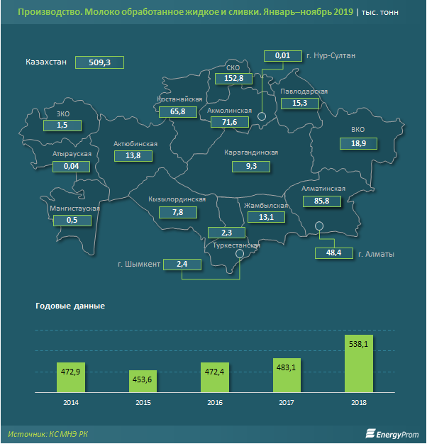 Производство молока растет. Так, за 11 месяцев в РК выпустили 509,3 тыс.