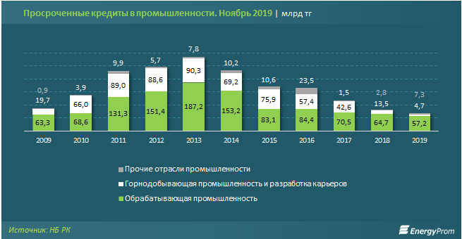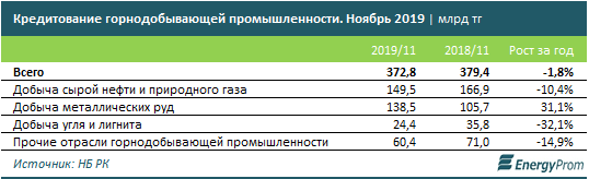займов пришлось на горнодобывающую промышленность (372,8 млрд тенге против 379,4