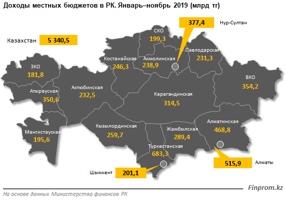 местных бюджетов составили 515,9 млрд и 468,8 млрд тенге соответственно. Замыкают топ-5 регионов столица (377,4 млрд тенге) и Восточно-Казахстанская область (354,2