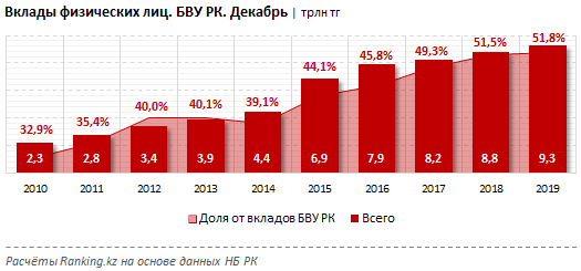 "От общего объема вкладов это составляет 51,8% против 51,5% год назад, лишь 39,1% — пять лет назад и 32,9% — по итогам 2010 года", - говорится в сообщении Ranking.kz.