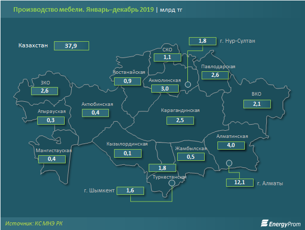 регионов по производству мебели в стоимостном выражении вошли Алматы (12,1 млрд