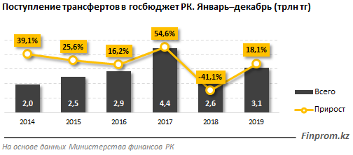 Поступления трансфертов в 2019 году составили 3,1 трлн тенге, при росте на