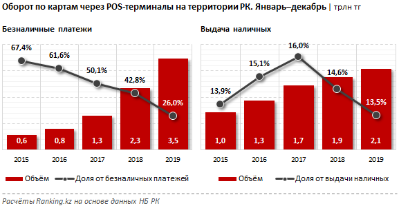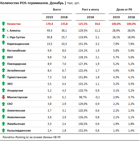 половина всех POS-терминалов находится в Алматы и Нур-Султане. Так, в Алматы их
