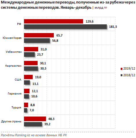 идет Южная Корея: объем переводов оттуда вырос на 15,7% и за 2019 год составил