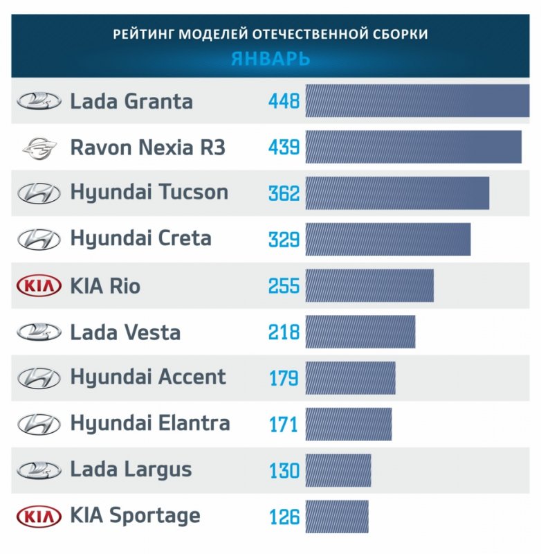 Granta (448 ед.), Ravon Nexia R3 (439 ед.), Hyundai Tucson (362 ед.), Hyundai