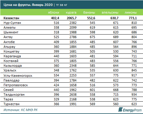 Самые дорогие яблоки и апельсины — в Усть-Каменогорске, курага и бананы — в