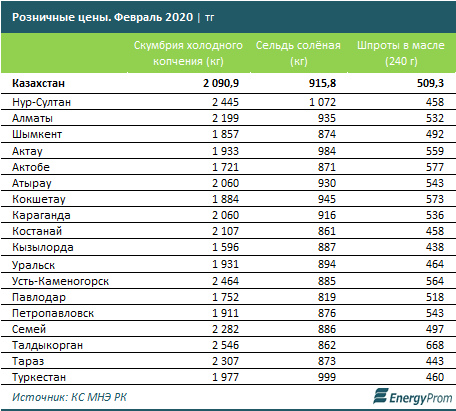 2091 тенге за кг, соленая сельдь — 915,76 тенге за кг, шпроты в масле — 509,3 тенге за