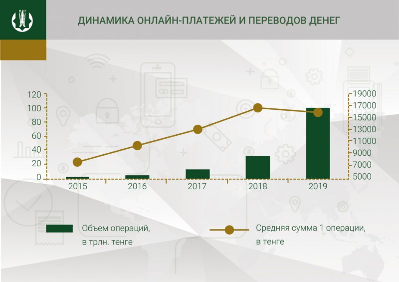 Следовательно, основная доля безналичных операций была проведена онлайн способом: 629,2 млн онлайн операций на сумму 9 988,2 млрд тенге, что занимает от общего количества безналичных платежей и переводов 52,6%, от объема – 71,1%. Таким образом, каждая вторая безналичная транзакция была проведена посредством интернет/мобильных сервисов банков. Средняя сумма такой операции составила 15 874 тенге.