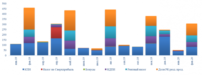сравнении с январем 2019 года, а февральские поступления уменьшились на 33,3%, до 307,0 млрд тенге.