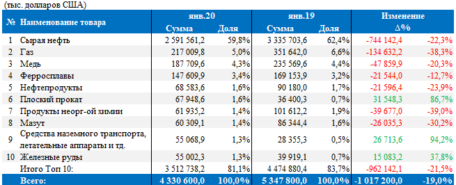 падение денежных поступлений от экспорта в абсолютном выражении в январе 2020