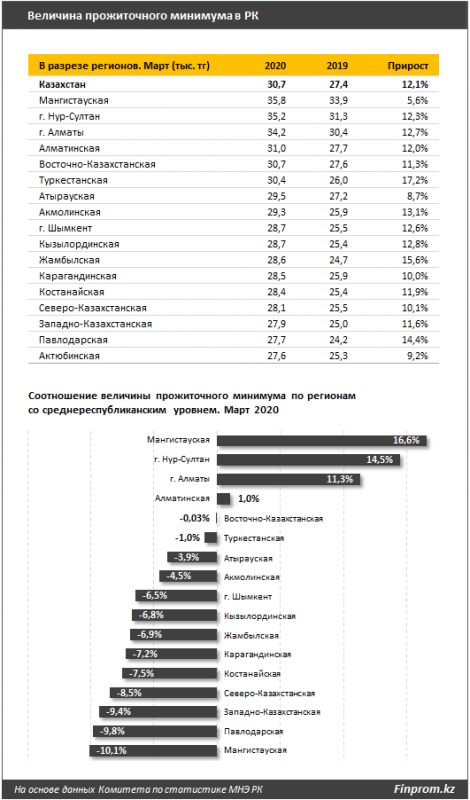 минимума также вошли Нур-Султан (35,2 тыс. тенге) и Алматы (34,2 тыс. тенге).