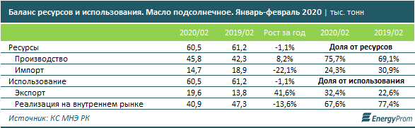 подсолнечного масла в Казахстане за январь–март 2020 года составил 44,4 тыс. тонн — на 19,5%