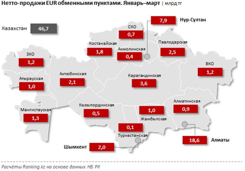 По объему нетто-продаж евро лидирует Алматы: 18,6 млрд тенге — на 55,6%
