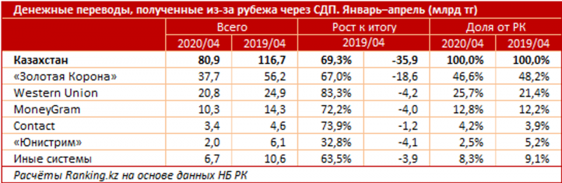 Western Union (20,8 млрд тг) и MoneyGram (10,3 млрд тг). Сокращение объемов
