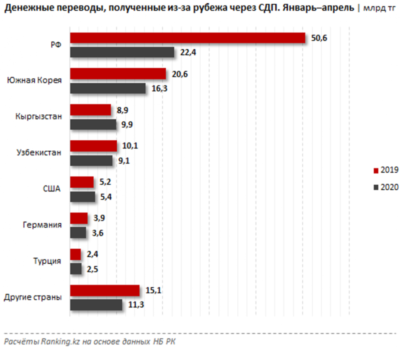 за апрель 2020 года из-за рубежа через СДП было переведено 12,6 млрд тенге — почти