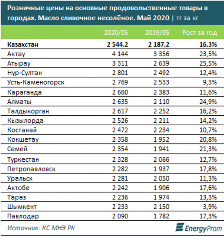 среди крупных городов и мегаполисов страны сливочное масло стоило в Актау,