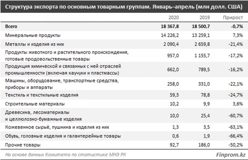 итогам четырех месяцев 2020 года 77,5% экспорта пришлось на минеральные