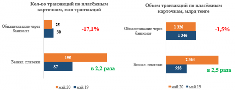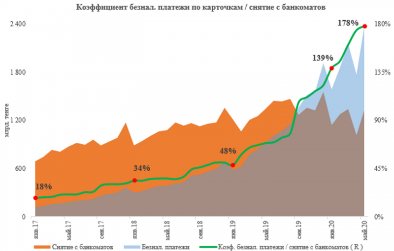тенге). На этом фоне отношение объема безналичных платежей по карточкам к