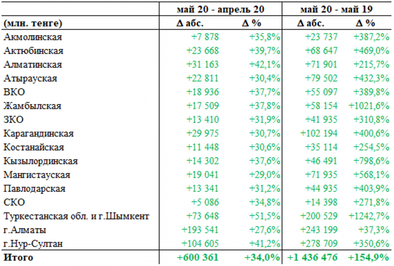 относительном выражении в мае продемонстрировали Туркестанская область и Шымкент (+51%), Алматинская область (+42%) и Нур-Султан (+41%).