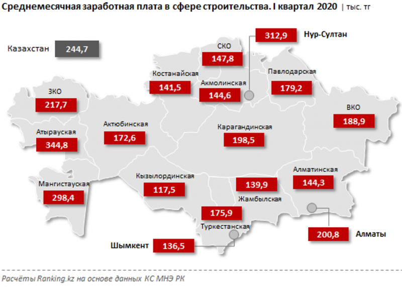 регионов РК среднемесячная заработная плата в сфере строительства варьируется