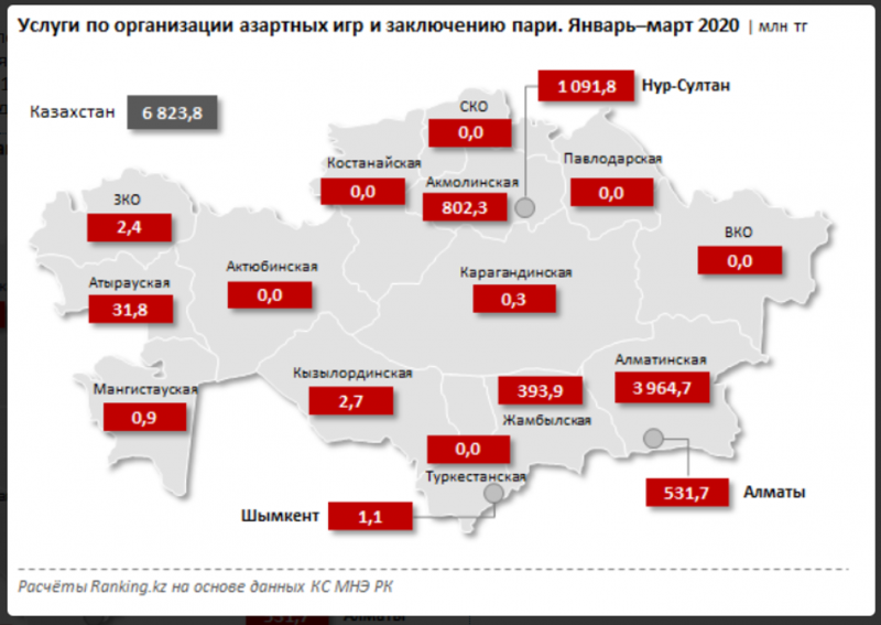 Среди регионов РК по объему услуг в данной сфере более 58% всего объема пришлось только на Алматинскую область, где на побережье Капшагайского водохранилища расположена одна из двух игорных зон страны: почти 4 млрд тг, рост за год — на 76,1%.