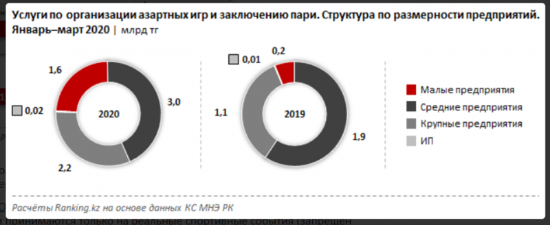 По итогам первого квартала текущего года по размерности предприятий наибольший объём услуг в сфере азартных игр и заключения пари приходится на средние предприятия (3 млрд тг, плюс 61,4% за год), следом идут крупные (2,2 млрд тг, годовой рост в 2,1 раза) и малые (1,6 млрд тг, рост в 8,6 раза) компании, на индивидуальных предпринимателей приходится лишь 19,6 млн тг (рост в 3 раза).