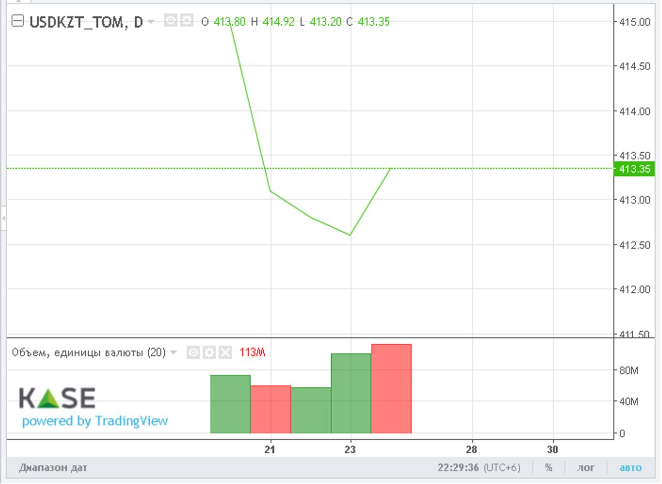 информации KASE, на торгах минимальный курс сложился на уровне 413,20 тенге за