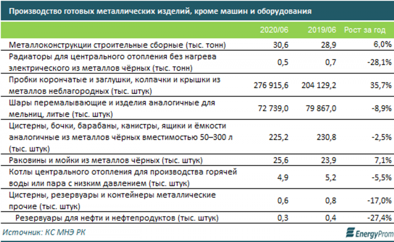 Более половины выпуска приходится всего на 4 региона 12.08.2020 · 19:05 Производство готовых металлических изделий в первом полугодии текущего года составило 117,1 млрд тенге — на 6,3% больше в денежном выражении, чем за январь–июнь 2019-го. Индекс промышленного производства при этом составил сразу 119,8%. Такие данные приводит energyprom.kz. В целом за 2019 год* объём производства составлял 242,8 млрд тенге, ИПП — 92,3%. * оперативные данные за январь–декабрь Более половины объёмов выпуска приходится всего на 4 региона. Лидирует Павлодарская область: 18,8 млрд тенге, рост за год — на 2,7% в денежном выражении. Следом идут Карагандинская область (17,7 млрд тенге), город Алматы (12,9 млрд тенге) и Мангистауская область (11,5 млрд тенге). Значительный рост производства был отмечен в Нур-Султане (более чем вдвое), Акмолинской ( 89,9% в денежном выражении) и Атырауской ( 84,6%) областях. Среди готовых металлических изделий наибольший рост производства отмечен в сегменте изготовления корончатых пробок, заглушек, колпачков и крышек — на 35,7%, до 277 млн штук. Рост показали также сегменты производства раковин и моек из чёрных металлов (на 7,1% до 25,6 тыс. штук) и сборных строительных металлоконструкций (на 6%, до 30,6 тыс. тонн). Самое заметное сокращение отмечено в сегментах производства радиаторов из чёрных металлов (на 28,1%, до 503 тонн) и резервуаров для нефти и нефтепродуктов (на 27,4%, до 278 штук).
