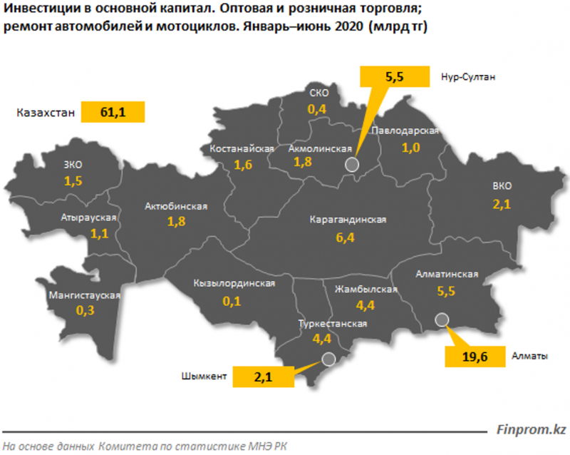 Сокращение отмечено в 13 регионах Казахстана из 17 13.08.2020 · 15:46 Объем инвестиций в сфере оптовой и розничной торговли, а также ремонта автомобилей и мотоциклов за январь-июнь 2020 года составил 61,1 млрд тенге, что является наименьшим показателем за первое полугодие начиная с 2016 года. Объем инвестиций сократился за год впервые за все время, причем сразу вдвое (ИФО — 52,8%). Такие данные приводит finprom.kz. В первом полугодии каждый месяц уступал аналогичному годом ранее. Самое заметное сокращение наблюдалось в июне 2020-го: сразу на 67,4% меньше, чем в июле 2019 года. Годовой рост инвестиций в основной капитал в сфере торговли и авторемонта по сравнению с прошлым годом был отмечен только в 4 из 17 регионов РК: Карагандинской ( 66,2%), Восточно-Казахстанской ( 12,5%), Акмолинской ( 6,9%) и Туркестанской ( 0,9%) областях. В целом же среди регионов РК по объему инвестиций лидирует Алматы: 19,6 млрд тенге, однако объем сократился на 32,9%. В тройку лидеров также вошли Карагандинская (6,4 млрд тенге) и Алматинская (5,5 млрд тенге) области. Почти 92% объема инвестиций в сфере торговли и авторемонта обеспечено за счет собственных средств: 56 млрд тенге, минус 47,6% за год. На кредиты банков приходится 4,1 млрд тенге — на 56,7% меньше, чем в прошлом году; на другие заемные средства — чуть менее 1 млрд тенге (–16%), из которых 256,5 млн тенге — иностранные средства (–44,5%).
