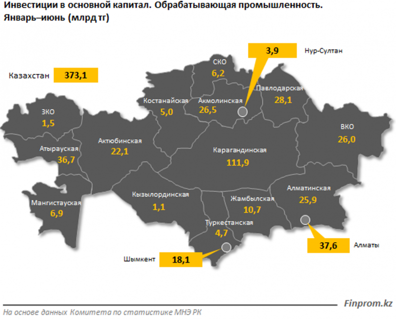 инвестиций в обрабатывающую промышленность лидирует Карагандинская область: