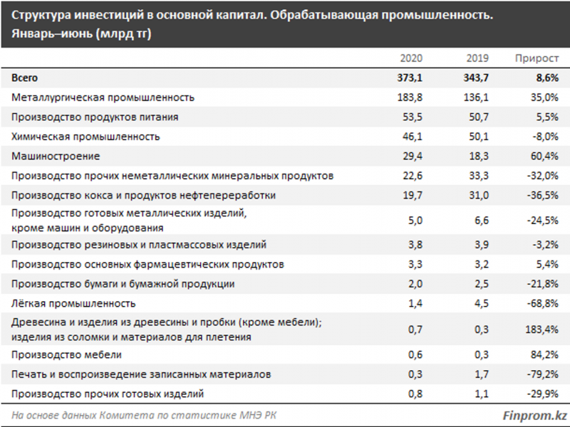 инвестиций в обрабатывающей промышленности пришлась на металлургию: 183,8 млрд тенге