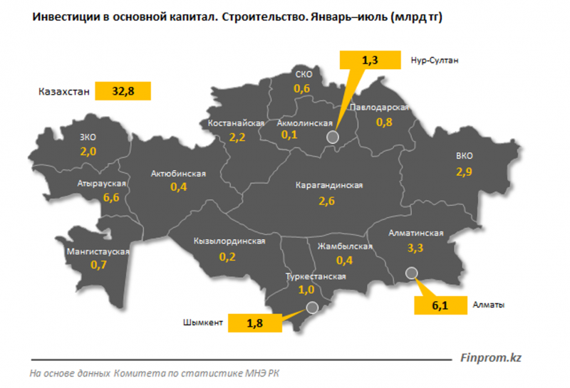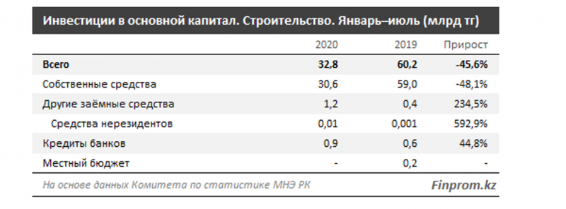 Инвестиции в основной капитал в сфере строительства за январь–июль 2020 года составили лишь 32,8 млрд тенге — почти в 2 раза меньше по сравнению с январём–июлем 2019-го (ИФО — 52,9%), пишет finprom.kz
