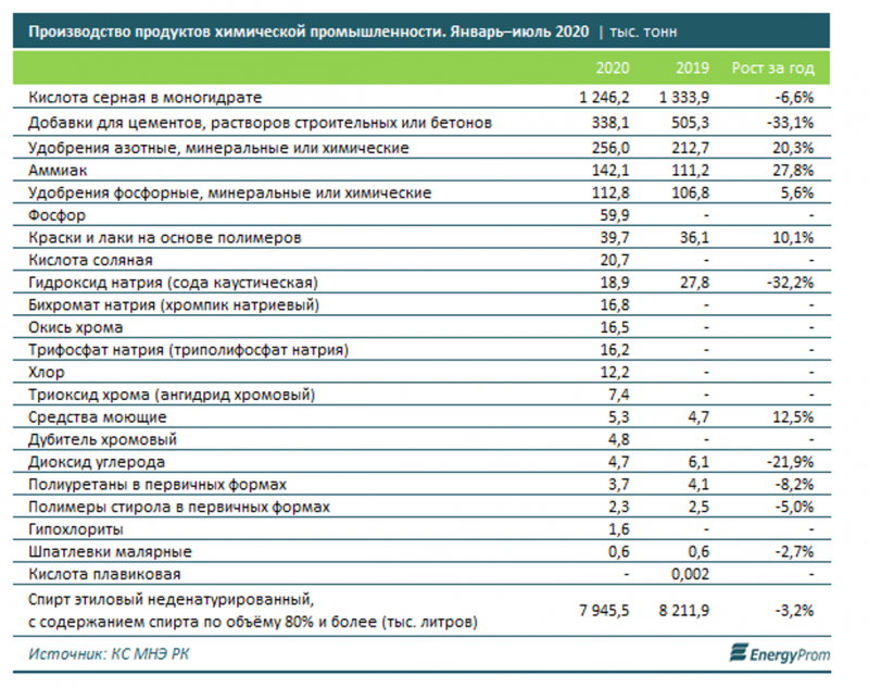 В целом за 2019 год объем производства достигал 466,2 млрд тенге, ИПП составлял 100,9%. Среди регионов РК наибольший объем производства продукции химической промышленности за 7 месяцев 2020 года пришелся на Жамбылскую область, где расположен крупнейший завод отрасли «Казфосфат»: 101,5 млрд тенге, рост за год — на 8,8%.