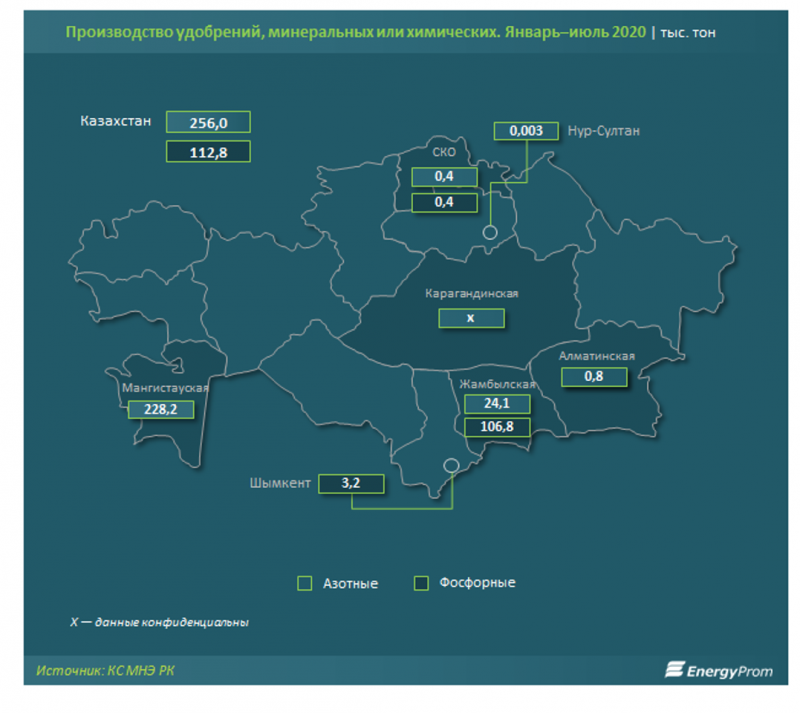 Почти 95% фосфорных удобрений ожидаемо производится в Жамбылской области: 106,8 тыс. тонн, плюс 7,2% за год.