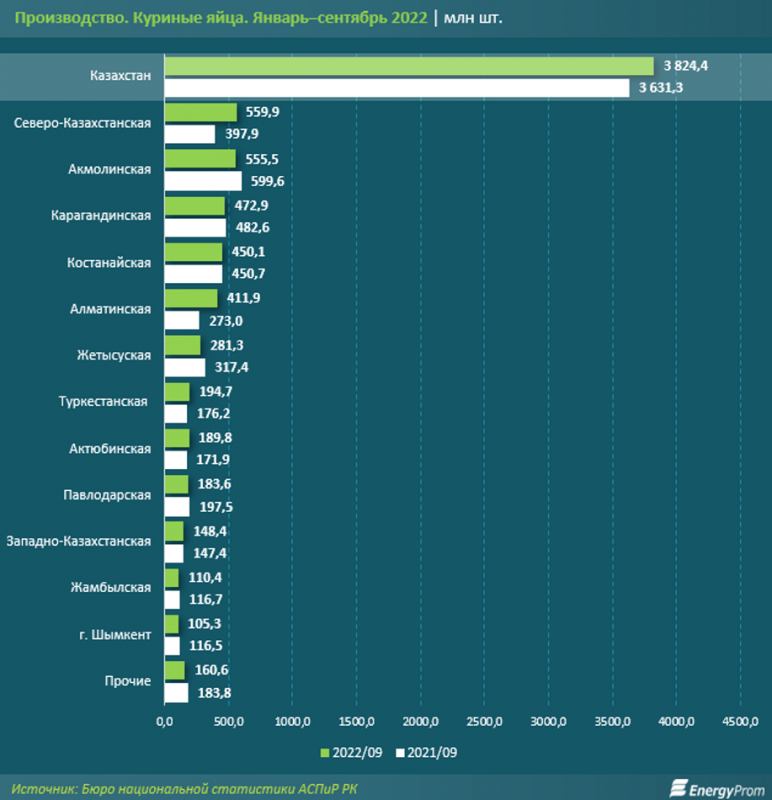 также оказались Акмолинская (555,5 млн яиц, минус 7,4%) и Карагандинская
