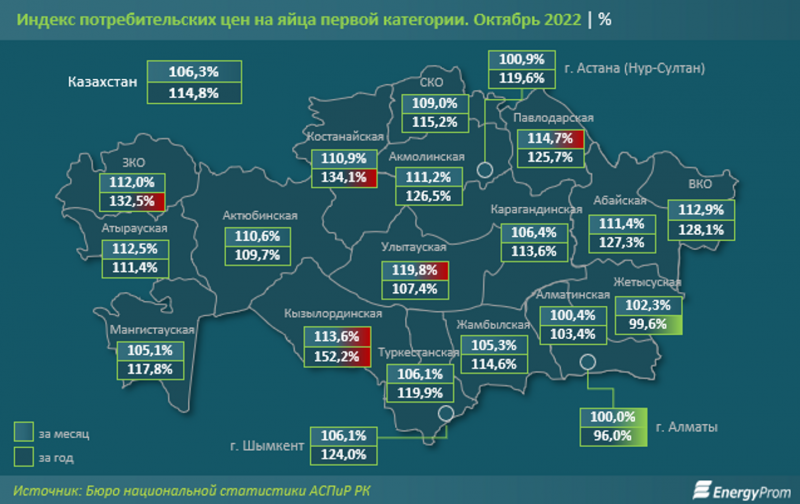 В годовой динамике яйца подорожали сразу на 52,2% в Кызылординской
