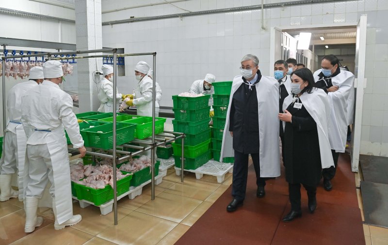 В ходе осмотра убойного цеха и выпускаемой продукции руководитель птицефабрики Фарида Джунусова ознакомила президента с деятельностью предприятия.
