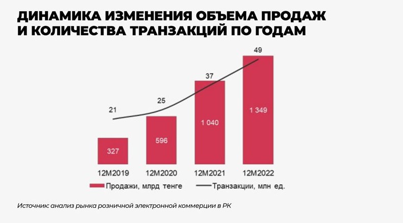 По данным исследования, несмотря на все потрясения 2022 года, электронная коммерция в Казахстане продолжает стремительно расти. За год ее объем вырос на 30%, до 1,3 трлн тенге.
