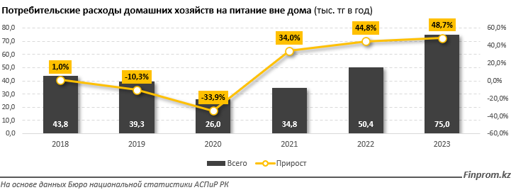 Казахстанцы стали тратить больше на питание вне дома. Согласно результатам выборочных обследований домашних хозяйств Бюро национальной статистики (БНС) АСПиР РК, в 2023 году годовая сумма у одной семьи по этой статье расходов приблизилась к 75 тыс. тенге. Хотя годом ранее на обеды в кафе, столовых и ресторанах жители страны тратили всего 50,4 тыс. тенге. Рост за период — на 48,7%. Это пик в динамике роста за последние несколько лет, отмечают в Finprom.kz.