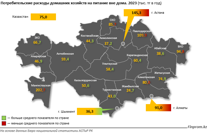 В региональном разрезе разница в расходах казахстанцев на обеды в кафе, столовых и ресторанах достаточно существенная, она коррелирует с уровнем экономического развития территорий. Например, если в Абайской области одна семья тратила на питание вне дома в среднем 38,6 тыс. тенге в год, то в Мангистауской — в 5 раз больше: 202,7 тыс. тенге. В этом западном регионе страны показатель таких расходов — самый высокий. В тройку регионов-антилидеров также попали Астана (145,3 тыс. тенге) и Павлодарская область (109,9 тыс. тенге). Меньше всего денег на перекусы и ресторанные застолья расходовали жители Жамбылской области (24,7 тыс. тенге), Шымкента (36,3 тыс. тенге) и Абайской области (38,6 тыс. тенге).