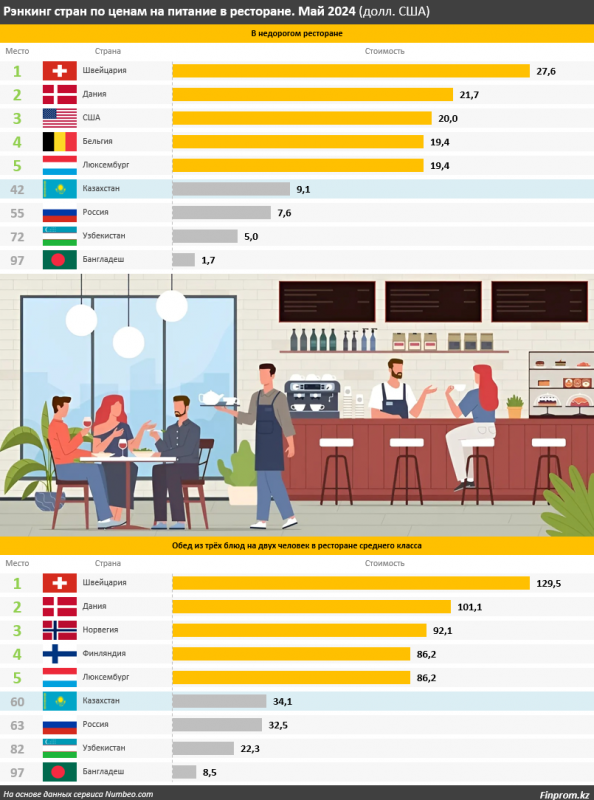 А вот другие интересные цифры для сравнения. Питание в кафе и ресторанах в Казахстане стоит дороже, чем в России. По информации аналитического сервиса Numbeo.com, ужин в недорогом ресторане в РК в мае этого года обходится посетителям в 9,1 доллара (чуть более 4 тыс. тенге), в то время как в российских гастрономических заведениях такого же уровня — в 7,6 доллара (3,4 тыс. тенге). По этому ценовому индикатору Казахстан занимает 42-ю строчку среди 97 стран. В первых рядах — европейские страны и США. Там обед в недорогом ресторанчике стоит в 2-3 раза дороже, чем в РК.