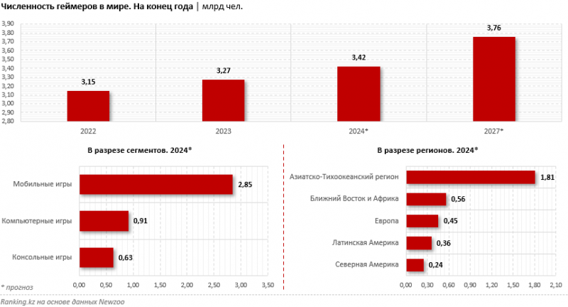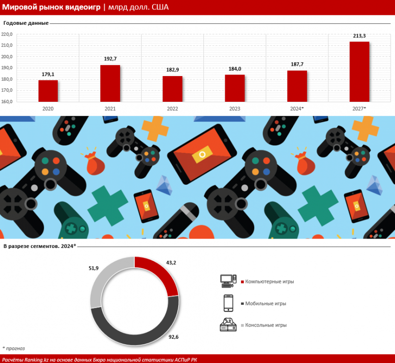 По информации специализирующейся на видеоиграх и данных об игроках аналитической компании Newzoo, опубликованной в августе прошлого года, в 2024 году объём мирового рынка видеоигр должен был составить 187,7 млрд долларов — на 2,1% больше, чем за 2023-й, но всё же меньше, чем в рекордном 2021 году. При этом аналитики прогнозируют рост к 2027 году до 213,3 млрд долларов, пишет ranking.kz.