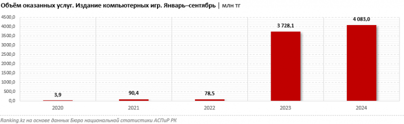 В Казахстане рынок компьютерных игр в последние два года показывает небывалый рост. Так, объём оказанных услуг по изданию компьютерных игр за январь–сентябрь 2024 года составил 4,1 млрд тенге — на 9,5% больше, чем за аналогичный период 2023-го. Для справки: в январе–сентябре 2022 года на этот сегмент приходилось лишь 78,5 млн тенге, а в рекордном для мира 2021-м — лишь 90,4 млн тенге, не говоря уже про январь–сентябрь 2020 года, когда показатель составлял лишь 3,9 млн тенге.