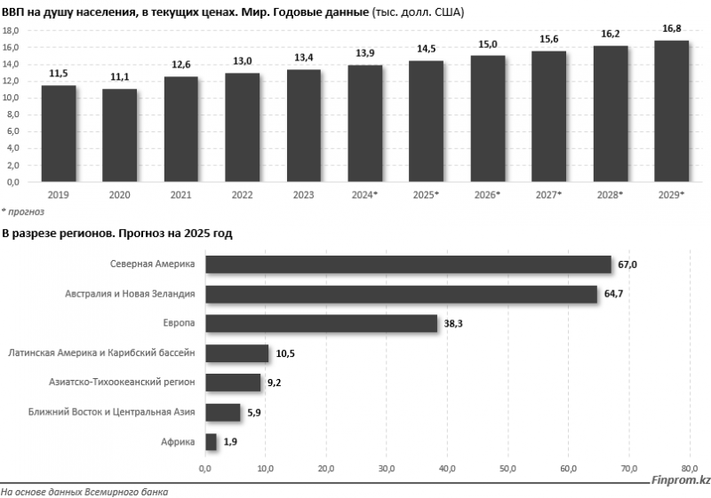 В то же время валовой внутренний продукт (ВВП) на душу населения в текущих ценах, по прогнозу Всемирного банка, в 2025 году достигнет в мире 14,5 тыс. долларов.
