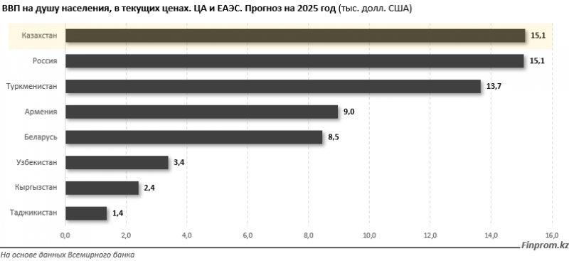 Среди государств ЦА и ЕАЭС по прогнозируемому ВВП на душу населения в текущих ценах лидируют Казахстан и Россия: по 15,1 тыс. долларов в каждой из стран. Следом идут Туркменистан (13,7 тыс. долларов), Армения (9 тыс. долларов) и Беларусь (8,5 тыс. долларов). Наименьшие показатели ожидаются в Таджикистане (1,4 тыс. долларов), Кыргызстане (2,4 тыс. долларов) и Узбекистане (3,4 тыс. долларов).