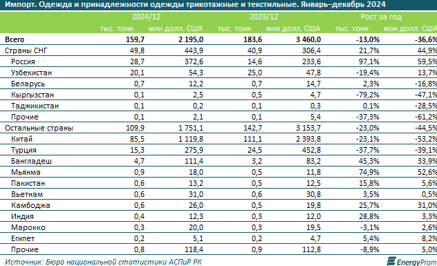 В свою очередь, импорт из стран, не входящих в СНГ, сократился на 23%, составив 109,9 тыс. тонн. Основные поставщики — Китай (85,5 тыс. тонн), Турция (15,3 тыс. тонн) и Бангладеш (4,7 тыс. тонн).