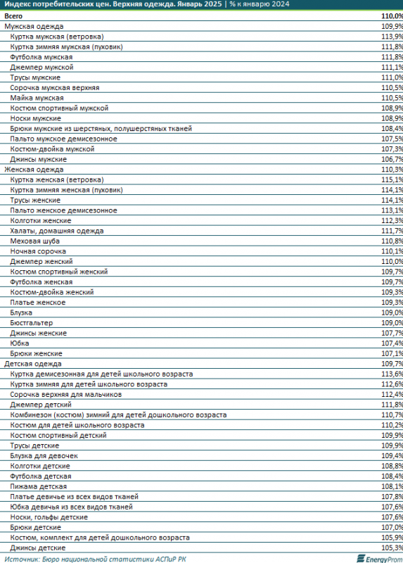 По итогам января текущего года цены на верхнюю одежду в Казахстане выросли на 10% по сравнению с аналогичным месяцем 2024 года. Наибольшее удорожание было отмечено в Туркестанской (на 19,1%), Восточно-Казахстанской (на 15,6%) и Абайской (на 13,8%) областях. Наименьший годовой рост цен зафиксировали в Павлодарской и Жамбылской областях: на 5,4% в каждом из регионов, сообщает Energyprom.kz.