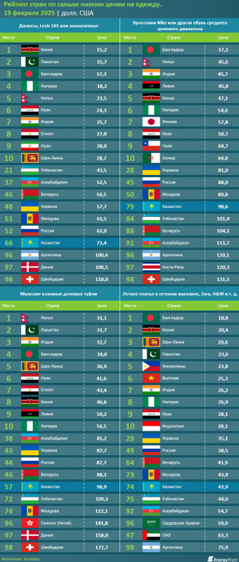 Самые дешевые джинсы в мире продаются в Кении, мужские кожаные туфли — в Непале, кроссовки и летние платья — в Бангладеш. При этом самые дорогие джинсы, мужские кожаные туфли и кроссовки приходится покупать жителям Швейцарии, а летние платья дороже всего обходятся в Аргентине.