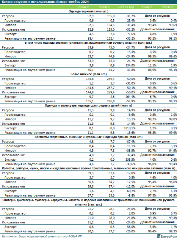 Обеспеченность спроса на трикотажную верхнюю одежду составила всего 0,5%: при производстве 182,6 тыс. единиц было импортировано 33,7 млн изделий. Спрос на нижнее бельё казахстанские компании покрыли лишь на 0,8%, на одежду и аксессуары для грудных детей — также на 0,8%, на свитеры, джемперы, пуловеры и прочую подобную одежду — на 0,9%. Более высокий показатель был зафиксирован для чулочно-носочных изделий (всё ещё лишь на 4,6%), а также для спортивных, лыжных и купальных костюмов (на 7,3%).
